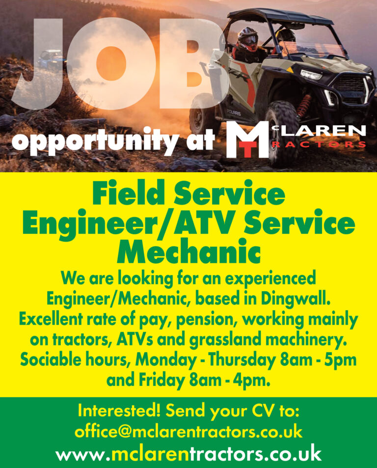 Our busy team requires an Engineer for the service and repair of Agricultural/ Plant machinery, in Dingwall, with work on site and on the farm. McLaren Tractors main franchises are McCormick Tractors, Polaris ATVs and McHale Grassland machinery. They also sell their own brands, Highland Machinery and MTL.