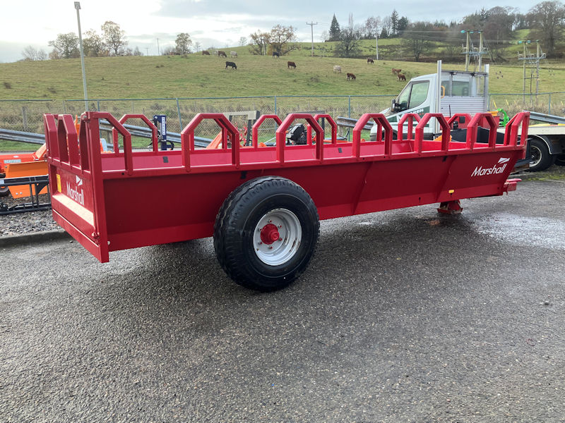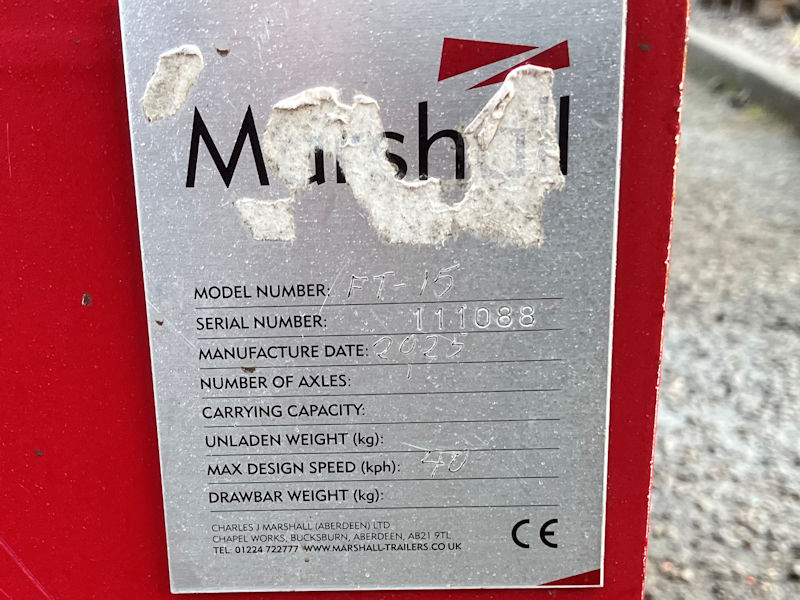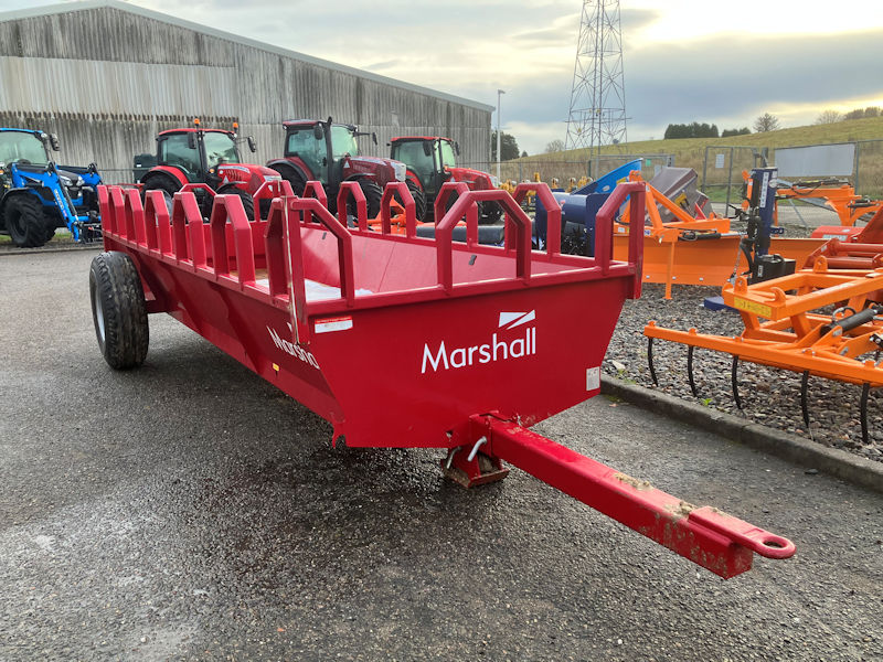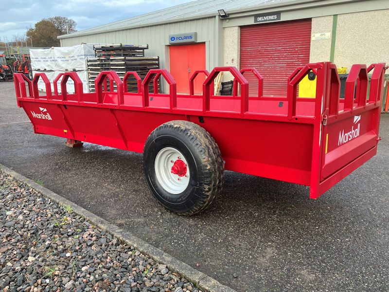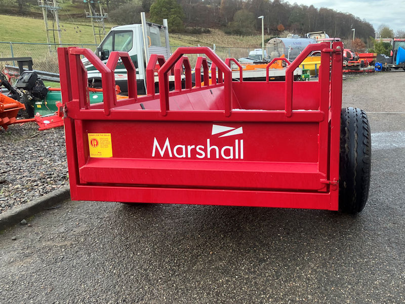 Marshall FT15 15ft cattle feed trailer with tombstone barriers for horned cattle, flotation tyres, opening back gate, drawbar skid and ring hitch, wooden floor and tapered sides.