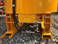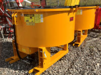 MTL 850 litre hydraulic drive pan mixer for sale, Category 2 3 point linkage mounting for tractors or pallet fork sleeves with locking pins for telehandlers and forklifts, hydraulically driven motor for mixing, spring loaded mixing paddles, side and rear discharge chutes, opening top stone grid with bag ripper, high pressure hydraulic hoses and quick couplers.