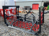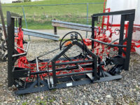 MTL Heavy Duty 4m hydraulic folding grass chain harrow for sale, two front rows of angle steel levelling bars and one rear levelling bar for smoothing out mole hills and divots, toothed mat with cast steel ripping stars to pull out thatch and aerate the pasture, Cat 2 linkage. This machine makes a great job harrowing grass and spreading animal muck over the pasture area, rejuvinating and aerating. The heavy levlling bars knowck down and spread mole hills allowing the grass to come through. The hydraulic folding wings have manual locking for raod transport. The reversible mat can be used for arable cultivations, breaking down clods and levelling.