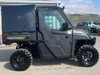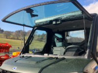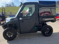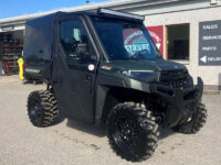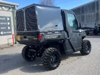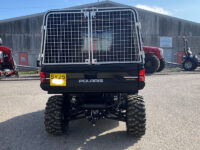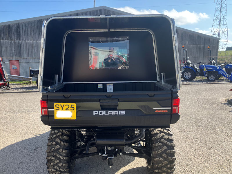 Polaris Ranger Diesel 2025 model 4×4 ATV ORV for sale, with full LED road lighting, independent adjustable suspension all round, shift-on-the-fly selectable 1,2 & all wheel drive, hydraulic disc brakes, 3 seats with seat belts, tip up passenger seat with underseat storage Polaris variable transmission with High, Low, Neutral, Reverse & Park, 2200lbs towing capacity, 7 pin trailer lighting socket, tow bar & ball, 454kg rear tipping loadbed with pick up style removable back door, Kubota 3 cylinder 902cc 25hp diesel engine, adjustable suspension all round, full deluxe cabin with additional sound proofing, deluxe seats with side padding, glass tip-out windshield with wiper & washer, glass rear panel, poly roof with liner, hard lockable doors with crank wind up glass windows, 3 speed fan with heater & screen de-mist, 14 inch alloy wheels with 27 inch tyres, fitted with 41 inch front mounted LED light bar & Highland Machinery Composite Aluminium Stealth Black canopy, galvanised steel frame, mesh barn doors with spring locking pins and “lock open” grommets, attached by 4 quick release Polaris Lock-n-ride anchors.