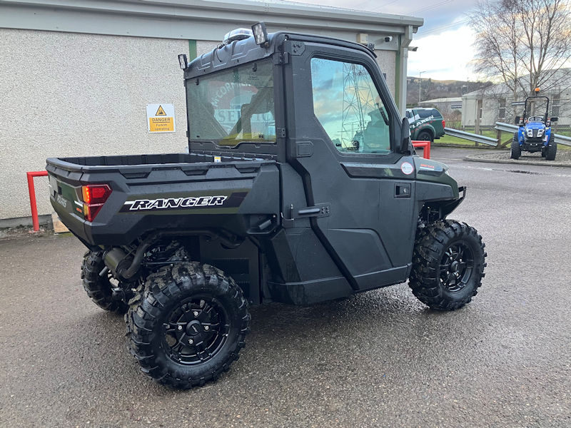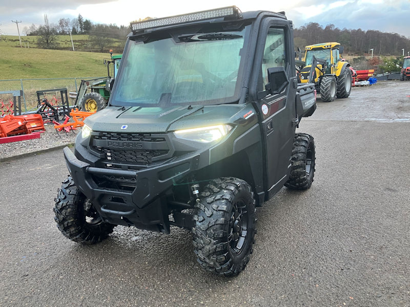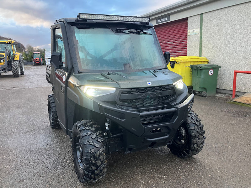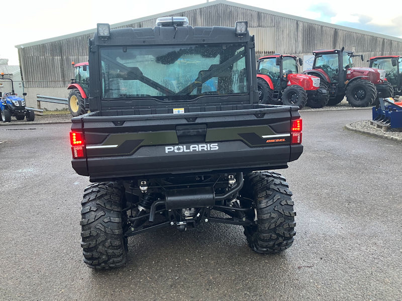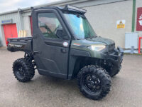 Polaris Ranger Diesel 902 with full cab 3 seat ORV ATV for sale, Kubota 25hp 3 cylinder engine, 3 seats with improved padding, fold up passenger seat & underseat storage, CVT transmission with High and Low range, Neutral Reverse & Park, 454kg rear tipping loadbed with removable pick up style back door, adjustable suspension & hydraulic disc brakes all round, in cab heater with screen de-mist, glass windows, tip out front winshield, gard roof with roof liner, crank up door windows, Road lighting with LED headlamps, 41 inch LED front light bar, rear facing LED worklamps and an LED beacon bar, 2 inch hitch recever for tow bar and 7 pin trailer lighting socket, 1 tonne towing capacity.