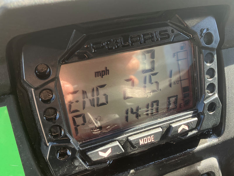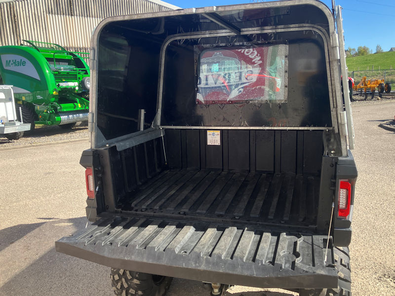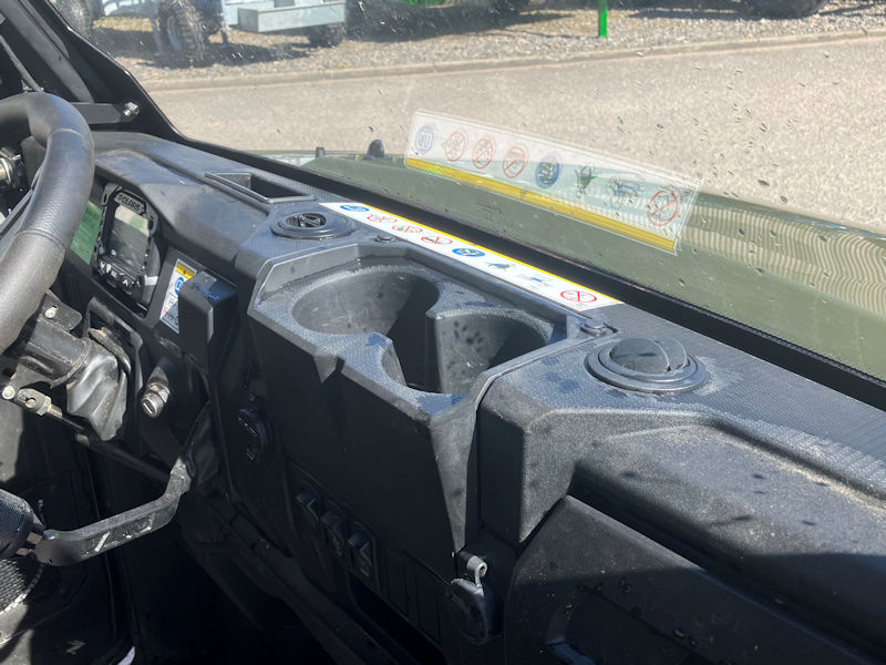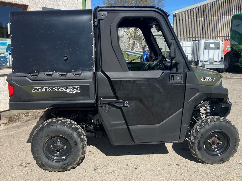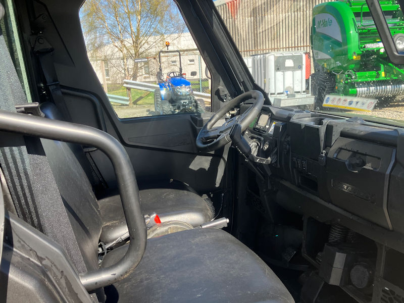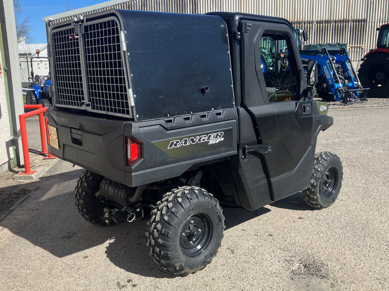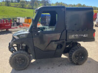 Polaris Ranger SP570 44hp 2 seat ORV ATV with canopy for sale, 2024 model, 44hp 570cc fuel injected petrol engine, able to deliver around 34mpg at a steady 25mph – this machine features greater suspension travel, more ground clearance, more spacious cabin, adjustable steering wheel, in-cab heater with screen de-mist, dash screen with fuel guage, trip meter, odometer, hour meter, speed, clock, engine temperature, battery voltage & seat belt indicator, c/w selectable 2 & 4wd, Versatrac turf mode, 2 seats with seat belts, park brake, full RTA road lighting, external rear view mirrors, 2 inch hitch receiver, 7 pin trailer electrics, tow bar & ball, independent suspension & hydraulic disc brakes, 227kg load box capacity, new deeper tipping load box with single lever pick up style easily removable back door, fitted with Highland Machinery Aluminium canopy with galvanised mesh barn doors, full cab with glass windscreen, wiper & washer, heater with screen de-mist, poly roof panel, rear glass panel, premium lockable doors with cranked windows. Road registered on 74 plate, only 216hrs.