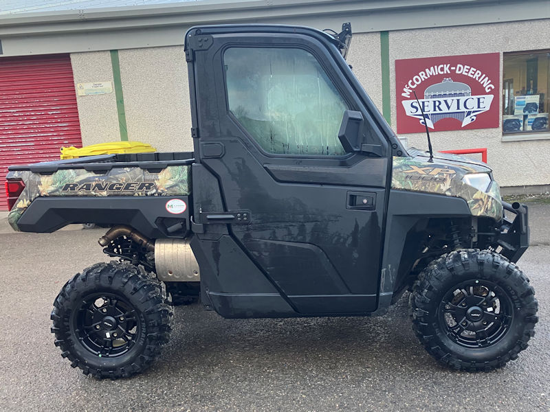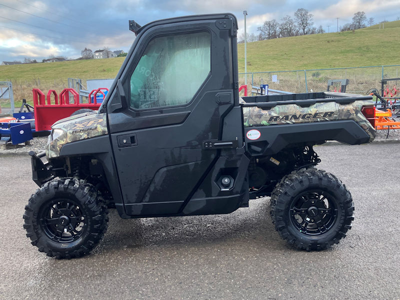 Polaris Ranger XP1000EPS Pursuit Camo 4×4 3 seat ATV ORV for sale, 90hp twin cylinder 1000cc fuel injected engine, Electronic power steering, shift on the fly 4wd engagement with turf mode & 2wd, 454kg tipping rear box capacity, 27 inch wheels & tyres, adjustable front & rear suspension, hydraulic disc brakes all round, full cab with glass windows, front tip out windshield, cabin heater with screen de-mist, multi channel radio with stereo speakers & external aerial, wing mirrors, road lighting, adjustable drivers seat, steering wheel rake adjustment, fold up passenger seats, underseat storage, roof mounted 41 inch LED light bar, pursuit camo colouring with colour coded seats, 2024 road registration, only 60hrs from new, some manufacturers warranty left