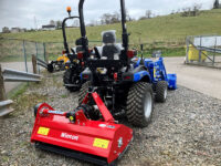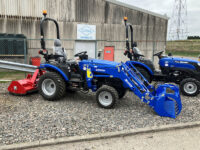 Solis 26H 26hp HST compact tractor galaxy tyres with loader and bucket grab for sale, 26hp Mitsubishi diesel engine, mechanical selection of 4wd, differential lock, 2 speed HST transmission with easy to operate and intuitive forward and reverse pedals, push button control of the independent 540rpm PTO, push button cruise control to make mowing and steady speed operations easy, folding ROPS, full road lighting package with rear worklamp, one piece opening bonnet with accessible battery, coolant, radiator and service items, flat floor platform, deluxe adjustable suspended operators seat, 1 double acting spool valve with two quick release couplings, Cat 1 3 point linkage, removable drawbar with jaw, 5 hole linkage drawbar, tool kit and operators manual. Fitted with parallel linkage front loader with electric 3rd service and quick attach bucket with opening grab, ideal for moving earth, brash and branches, Galaxy combination tyres with grass/agricultural pattern, tractor with 5 year warranty. Flail topper available at extra cost.